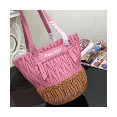 MiuMiu 2019 Nappa Leather and Wicker Bucket Tote Shoulder Bag,22cm - 미우미우 2019 나파 레더 위커 버킷 토트 숄더백,5BE021, MIUB0197 , 22cm,핑크